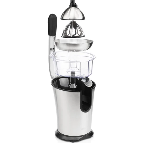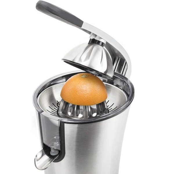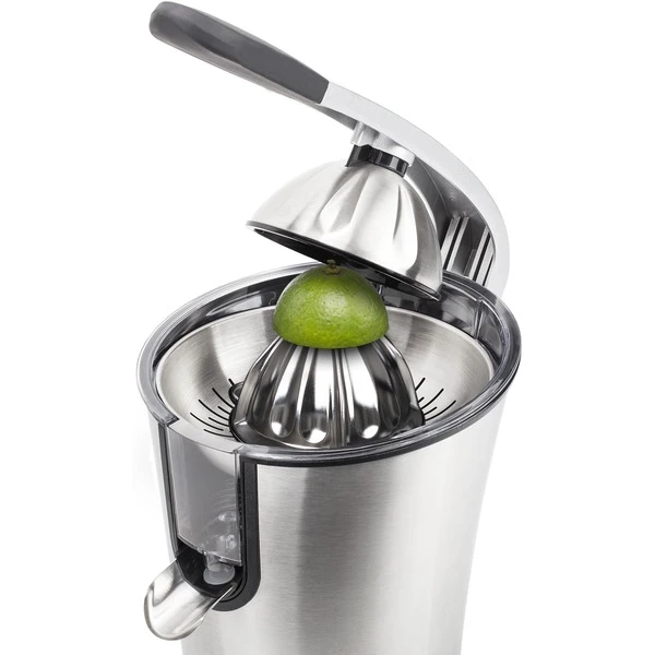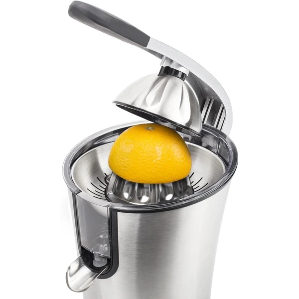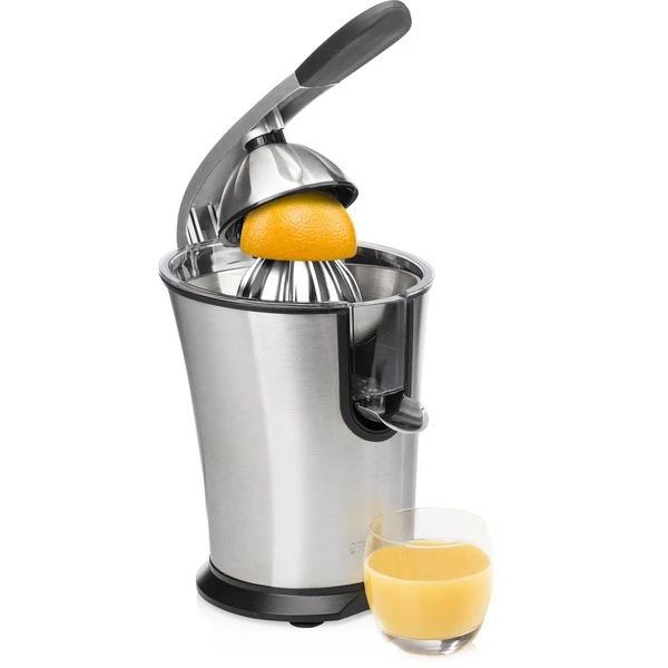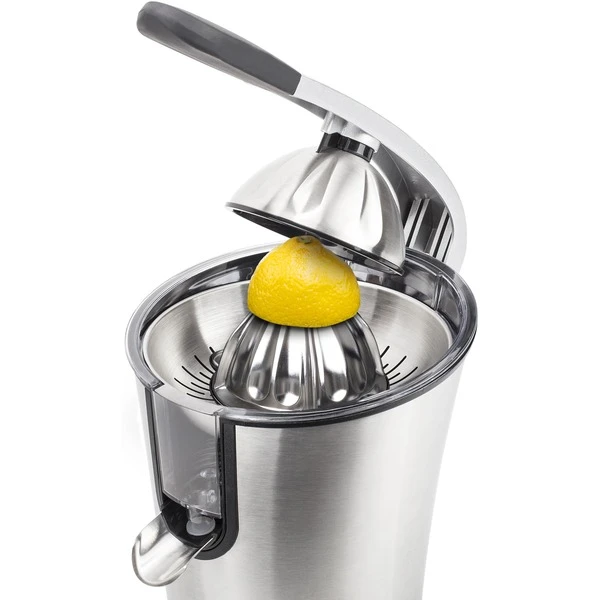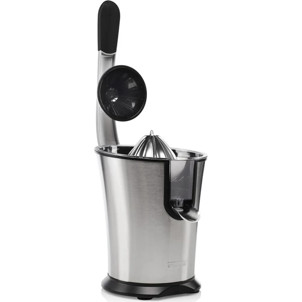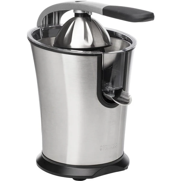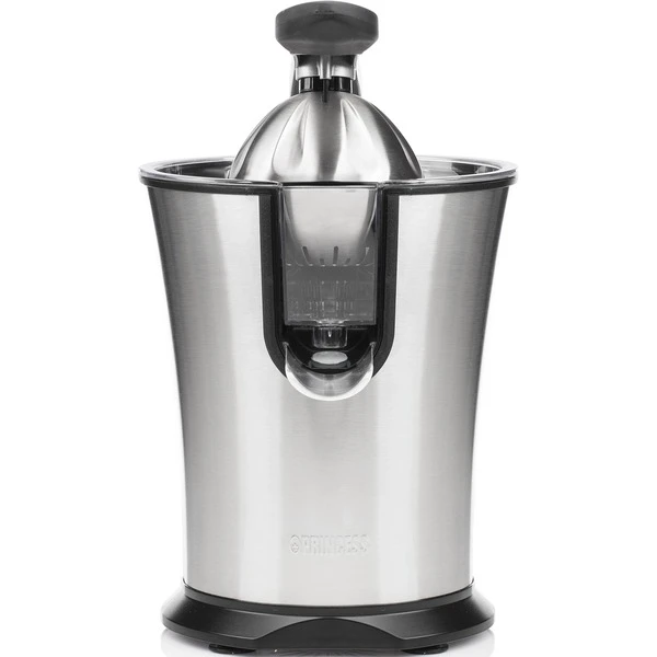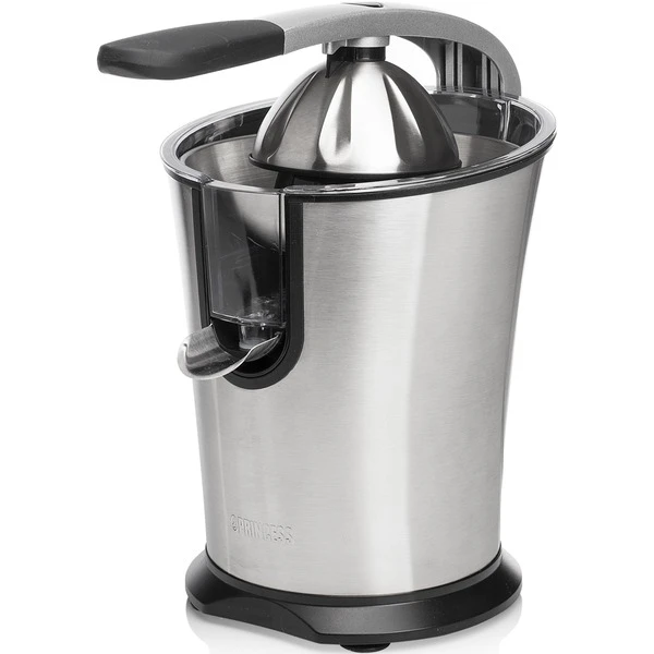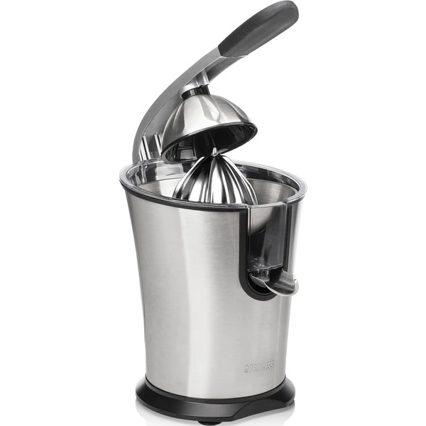 Das Pressen von Zitrusfrüchten wie Orangen ist mit dem Princess Master Juicer Pro ein Kinderspiel. Diese leistungsstarke Zitruspresse hat einen Griff und einen Edelstahlkonus sowie ein Fruchtfleischfilter. Sie verfügt über 300 Watt Leistung, sodass man große und kleine Zitrusfrüchte pressen kann – sogar Granatäpfel. Das gesamte Gehäuse ist aus Edelstahl gefertigt. Das gilt auch für den Konus und den regulierbaren Fruchtfleischfilter. Der Entsafter verfügt über einen Hebel, mit dem sich die Zitrusfrüchte einfach und schnell auspressen lassen. Perfekt, um viele Gläser Orangensaft in kürzester Zeit zuzubereiten. Somit eignet sich diese professionelle Orangenpresse ideal für das Gaststättengewerbe oder bei Anlässen, für die viele Früchte gepresst werden müssen. Die Presse ist mit rutschhemmenden Füßen ausgestattet, sodass sie immer fest auf der Arbeitsplatte steht, auch während des Auspressens. Darüber hinaus hat die Zitruspresse Princess Juicer Pro ein schickes Design, bei dem Edelstahl mit schwarzen Elementen kombiniert wurde – eine wahre Schönheit für die Küche. Nach der Verwendung lässt sie sich einfach zerlegen und dank des robusten Edelstahlmaterials können sämtliche Teile des Master Juicer Pro in dem Geschirrspüler gereinigt werden.