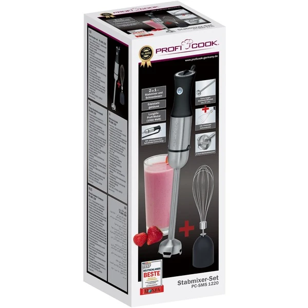 Das 2in1 Stabmixer-Set PC-SMS 1220 mit Schneebesen von ProfiCook ist, dank 1000 Watt Longlife-Profi-Motor, perfekt geeignet zum schnellen Mixen und Pürieren von Suppen, Saucen, leichten Teigen, Babynahrung, Milchshakes usw. Durch den extra langen Stab ist er auch für hohe und schmale Mixgefäße (ca. 27 cm) geeignet. Der breite Mixkopf sorgt für sicheres, spritzgeschütztes Zerkleinern und kann auch im heißen Topf zum Einsatz kommen. Ausgestattet ist der PC-SMS 1220 mit einem 4-fach Edelstahlmesser, einer stufenlosen Geschwindigkeitsregulierung, einem blau beleuchteten Tastschalter sowie einem ergonomischen Soft Touch-Griff.