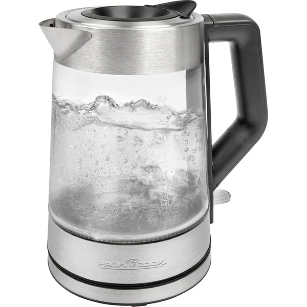 Der ProfiCook Glas-Wasserkocher PC-WKS 1190 G fasst bis zu 1,7 Liter Wasser und besteht aus hitzebeständigem Sicherheitsglas. Die Basisstation mit Kabelaufwicklung ist edelstahlummantelt. Dank der 360°C Basisstation kann der Wasserkocher in jeder Position aufgestellt werden, dabei beendet ein Abheben sofort den Kochvorgang. Die 5-farbige Beleuchtung des Wasserbehälters ist temperaturabhängig. So kann an der Farbe die aktuelle Wassertemperatur abgelesen werden. Das verdeckte Edelstahlheizelement erleichtert die Reinigung. Neben einer automatischen und manuellen Abschaltung, sorgen der Trockengeh- und Überhitzungsschutz für Sicherheit.Art.-Nr.: 1629300