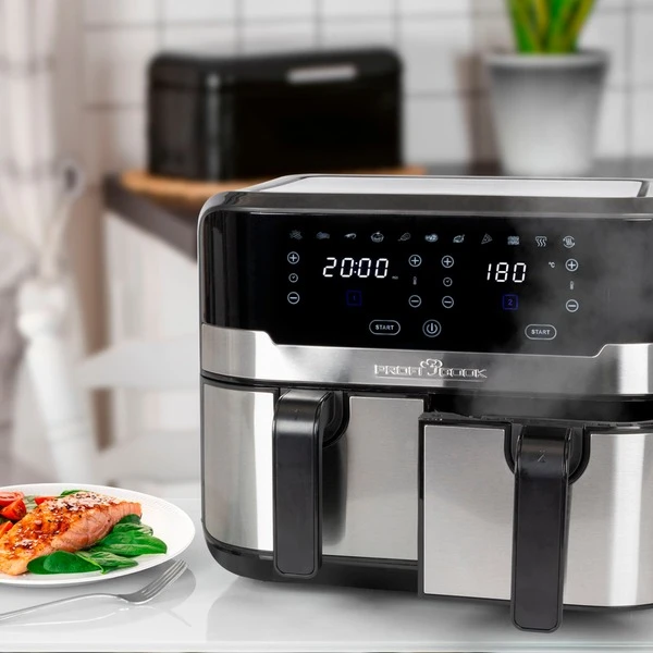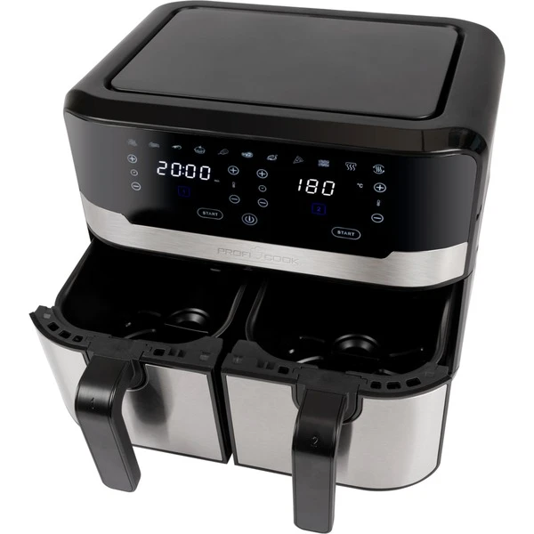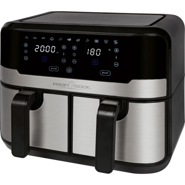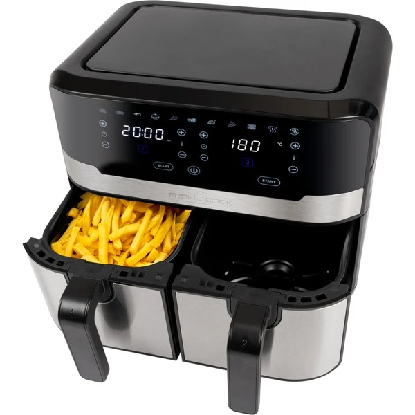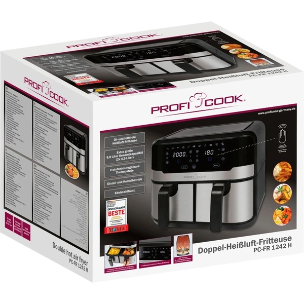 Die ProfiCook PC-FR 1242 H bietet doppelten Spaß für die ganze Familie. Die ProfiCook Heissluftfritteuse XXL besitzt ein Gesamtvolumen von 9 Litern, aufgeteilt in 2x 4,5 Liter Körbe. Die beiden Frittier-Fächer sind separat steuerbar und sorgen dafür, dass die Lebensmittel sich nicht vermischen. In der Fritteuse Heissluft ohne Fett lassen sich so bis zu 1,2 kg Pommes gleichzeitig herstellen. Dank 360°-Airflow-Technologie heizt die Doppel Heißluftfritteuse die Luft auf bis zu 200°C und gart Pommes, Nuggets, Fisch oder Fleisch mit bis zu 85% weniger Fett als herkömmliche Fritteusen mit Öl. Somit eignet sich die Friteuse Heißluftfritteuse nicht nur für Familie und Freunde, sondern auch für Sportler und Fitness-Fans. Die Heißluftfritteuse XXL ist dank 2 LED-Displays mit Sensor-Touch Bedienung einfach zu bedienen. Es kann komfortabel aus 9 Automatik-Programmen ausgewählt werden (Pommes, Garnelen, Kuchen, Hähnchen, Kotelett, Steak, Fisch, Rippchen und Speck). So ist sie schnell einsatzbereit und bereitet fast automatisch leckere Speisen und Snacks zu. Für eine leichte Reinigung sind die 2 Behälter der Heißluft-Fritteuse antihaftbeschichtet und verhindern so, dass Speisen oder Fett anbrennen. Die zwei Siebeinsätze sind herausnehmbar und können einfach abgewaschen werden. So geht die Hausarbeit nach einem köstlichen Essen leicht von der Hand. Die Heißluftfritteuse mit 2 Fächern ist neben den 9 Programmen auch individuell einstellbar. Die Zeit und Temperatur können frei gewählt werden. Darüber hinaus punktet die Heißluftfritteuse mit einer variablen Auftau-/Warmhaltefunktion.Art.-Nr.: 1900563
