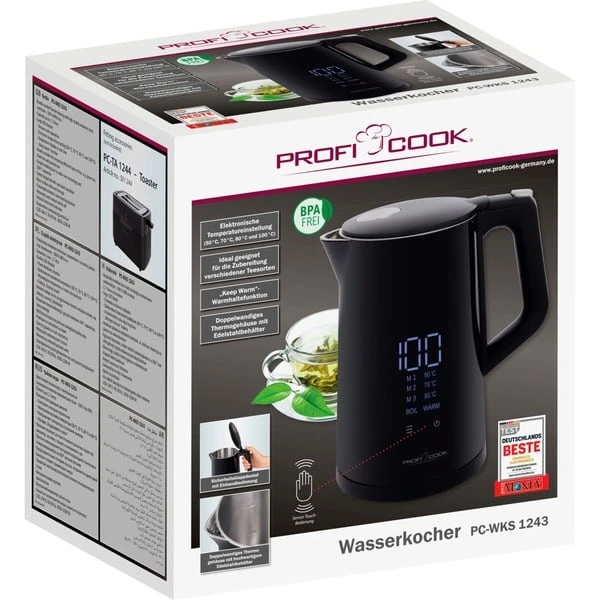 Mit dem ProfiCook PC-WKS 1243 Wasserkocher mit Temperatureinstellung kann man seinen Tee genau nach dem eigenen Geschmack zubereiten. Dank der elektronischen Temperatureinstellung von 50°C bis 100°C können kinderleicht die einzelnen Temperaturstufen 50°C, 70°C, 80°C und 100°C ausgewählt werden. Das doppelwandige Thermogehäuse und der hochwertige Edelstahlbehälter sind 100% BPA-frei und ermöglichen eine Füllmenge von bis zu 1,7 Litern. Über das große LED-Display kann man die Temperaturanzeige in Echtzeit verfolgen. Die „Keep Warm“ Funktion hält den Tee warm. Die Bedienung ist einfach dank kabelloser Technik, Sensor-Touch-Bedienung und 360° drehbare Steckverbindung, sowie der sichere Klappdeckel mit Einhandbedienung. Der Wasserkocher mit Temperaturanzeige bietet eine automatische und manuelle Abschaltung, eine innenliegende Wasserstandsanzeige sowie einen Trockengeh-/ÜberhitzungsschutzArt.-Nr.: 1907167