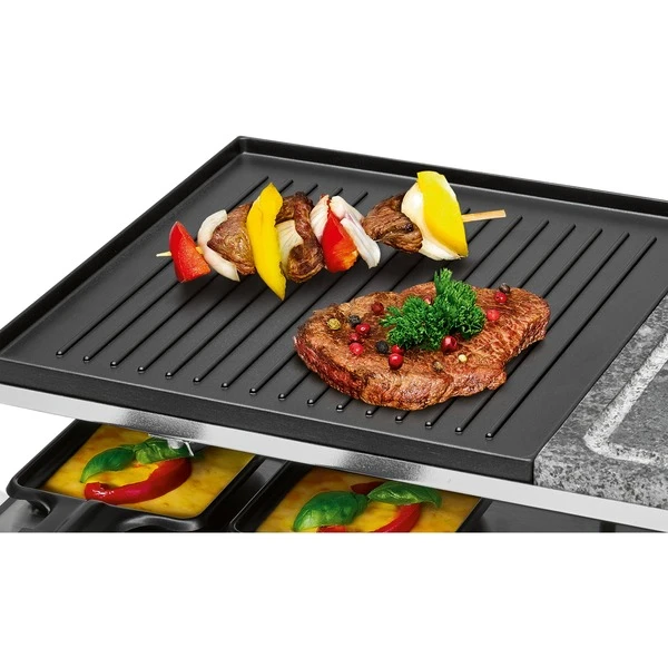 Grillen und genießen, deftig oder gesund – mit dem eleganten und hochwertig verarbeiteten Raclette-Grill von ProfiCook. Das leistungsstarke (1700 Watt) Raclette besteht aus einem Naturgrillstein für gesundes und fettarmes Grillen von Gemüse und einer Wendegussplatte mit kombinierter Grillfläche zum Grillen von Fisch oder Fleisch. Mit einer extra großen Grillfläche von ca. 48,5 x 24 cm (2x ca. 24 x 24 cm) findet jede Zutat Ihren richtigen Platz. Bis zu 10 Personen haben die Möglichkeit die antihaftbeschichteten Pfännchen inklusive wärmeisoliertem Griff mit Zutaten Ihrer Wahl zu befüllen. Die kombinierte Grillfläche der Wendegussplatte bietet zum Grillen von Fisch eine glatte Oberfläche oder extra tiefe Rillen für ein intensives Grillmuster für Fleisch. Mit dem Naturgrillstein lässt sich gesund und fettarm Grillen. Er speichert die Wärme, wodurch das Grillgut schonend gegart und dadurch zart und saftig wird. Mit Hilfe des stufenlos regelbaren Thermostat lässt sich die Temperatur individuell und ganz nach den persönlichen Bedürfnissen regulieren. Zusätzlich zeigt die Kontrollleuchte (rot beleuchtet) an, wenn das Gerät eingeschaltet ist. Für eine einfache Reinigung ist das Gerät leicht zerlegbar. Im Lieferumfang sind 10 Pfännchen und 10 Holzspachtel enthalten. Die Pfännchen können dank Antihaftbeschichtung (schneid- und kratzfest) leicht und schnell gereinigt werden.