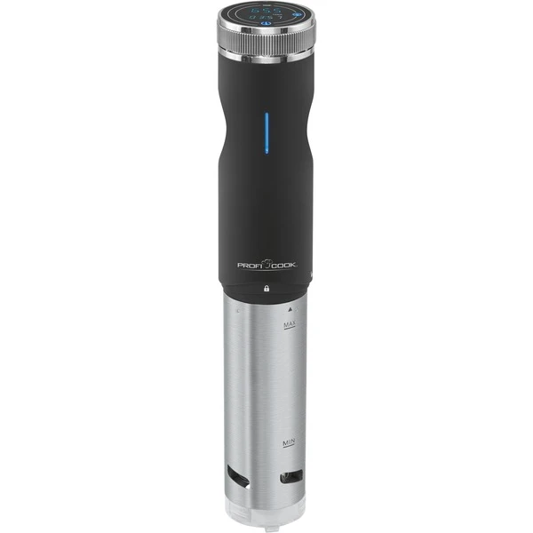 Der Sous Vide Stab PC-SV 1126 von ProfiCook im Edelstahlgehäuse mit ergonomischem Soft Touch-Griff, ermöglicht punktgenaues Garen von Speisen durch einfache, elektronische Temperaturregelung. Die Temperatur lässt sich von 0 °C bis 90 °C, in 0,5 °C-Schritten, einstellen. Die maximale Abweichung beträgt +/– 0,5 °C. Dabei werden 7–8 l/min Wasser umgewälzt. Durch diese Garmethode bleiben Vitamine, Vitalstoffe und Aromen erhalten. Der Stab eignet sich für alle hitzebeständigen Gefäße ab ca. 15 cm Höhe und wird mit der integrierten Befestigungsklemme gehalten. Die Bedienung erfolgt über ein Sensor Touch-Bedienfeld mit LED-Multifunktionsdisplay. Auf dem Display wird der Timer, die gewählte sowie die aktuelle Temperatur angezeigt. Der PC-SV 1126 bietet zu dem normalen Sous Vide garen noch eine Joghurtmaker-, Warmhalte- und Auftaufunktion. Sollte das Wasser mal verdampft sein, schaltet sich der Sous Vide Stab automatisch ab.