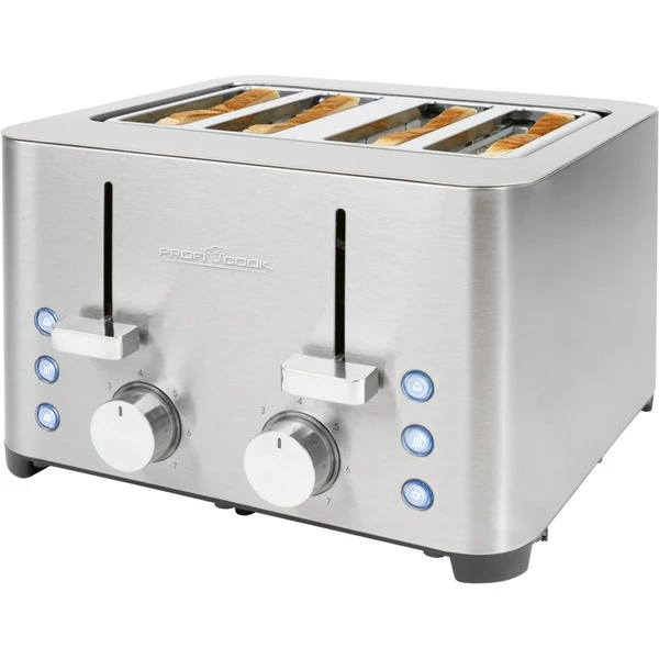 Der ProfiCook PC-TA 1252 Edelstahl ist ein hochwertiger 4-Scheiben Toaster mit 2 stufenlosen einstellbaren Bräunungsgradreglern und Zentrierfunktionen für gleichmäßige Bräunung. Der Toaster verfügt über extra breite Toast-Schlitze (40mm) für dicke und dünne Toast-Scheiben, ebenfalls perfekt für Bagels und Toastbrötchen geeignet. Der beiden Brötchenaufsätze sind abnehmbar. Mit der Zentrierfunktion wird der Toast gleichmäßig gebräunt. Der Toaster verfügt über 2 Auftau-, 2 Aufwärm- und 2 Schnellstoppfunktionen (weiß beleuchtet) und enthält 2 Krümelschubladen (herausnehmbar), eine Kabelaufwicklung und bietet durch die gummierten Füße einen sicheren Stand.Art.-Nr.: 1886309