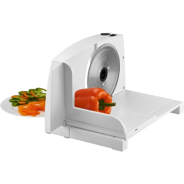 Der klappbare Allesschneider markant 05 von ritter bietet einfache, sichere Bedienung und zuverlässige Funktion. Die Schnittstärke lässt sich stufenlos bis ca. 14mm einstellen. Es stehen zwei Betriebsarten zur Auswahl. Für den Kurzbetrieb wird der Schalter gedrückt und bis zum Widerstand vorgeschoben. Das Rundmesser läuft, solange der Schalter in dieser Position gedrückt bleibt. Für den Dauerbetrieb wird der Schalter gedrückt und über den Widerstand hinaus geschoben, bis er einrastet. Das Rundmesser läuft in dieser Betriebsart, ohne dass der Schalter gedrückt bleiben muss, bis der Schalter zurück in die Position „0“ geschoben wird. Mit der Varioelektronik kann die Messerdrehzahl dem jeweiligen Schneidgut angepasst und damit ein optimales Schneidergebnis erzielt werden. Eine langsame Drehzahl ist für weiches Schneidgut und eine schnelle für hartes Schneidgut einstellbar. Angetrieben wird der markant 05 durch einen 65 Watt Eco-Motor, der im Vergleich zum Vorgängermodell 20% sparsamer und trotzdem 50% kraftvoller ist. Aufgeklappt steht er rutschfest auf der Arbeitsplatte. Durch den teilbaren Schlitten bleibt der Allesschneider aus pflegeleichtem Kunststoff auch zusammengeklappt immer komplett. Zusammengeklappt ist er nur noch 10,5cm breit. So lässt sich der Allessschneider so gut wie in jeder Nische verstauen.Art.-Nr.: 1086160