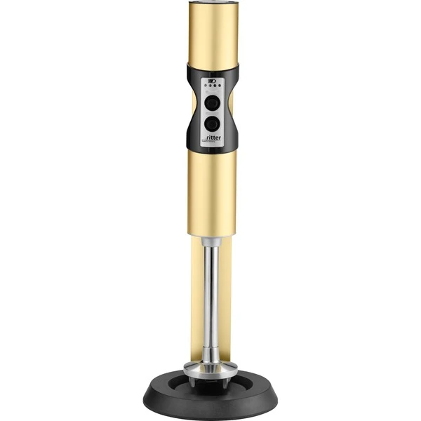 Der Stabmixer stilo7 in gold verfügt über eine hohe Materialqualität und besteht zum größten Teil aus stabilem Metall, während der Griff zugunsten angenehmer Ergonomie aus hochwertigem Kunststoff ist. Aufgrund des Akkubetriebs sorgt der kabellose Stabmixer für absolute Freiheit beim Kochen. Über eine LED-Anzeige kann der Ladestand des Akkus einfach abgelesen werden. Der Lithium-Ionen-Akku wird dank intelligenter Ladetechnik schonend und langsam aufgeladen ohne zu überladen. Der Ladevorgang endet automatisch, sobald der Akku voll ist. Diese Ladetechnik sorgt für eine lange Lebensdauer des Akkus. Auch das Thema Sicherheit kommt beim Stabmixer stilo7 nicht zu kurz: Er verfügt über ein Sicherheits-2-Finger-Einschaltsystem. Damit ein versehentliches Anschalten verhindert wird, müssen Entsperr- und Einschalttaste gleichzeitig betätigt werden. Der Stabmixer läuft mit maximaler Drehzahl von ca. 12.000 Umdrehungen pro Minute an. Mithilfe des Durchschaltsystems können dann zwei weitere niedrigere Drehzahlstufen ausgewählt werden. Als Schutz vor Überlastung schaltet das Gerät beispielsweise bei Blockade des Messers oder Überhitzung automatisch ab. Mit dem Universalmesser lassen sich die meisten Lebensmittel Pürieren. Der Kunststoff-Mixbecher ist durch seine schmale, hohe Form optimal für die Verarbeitung geeignet.Art.-Nr.: 1834776