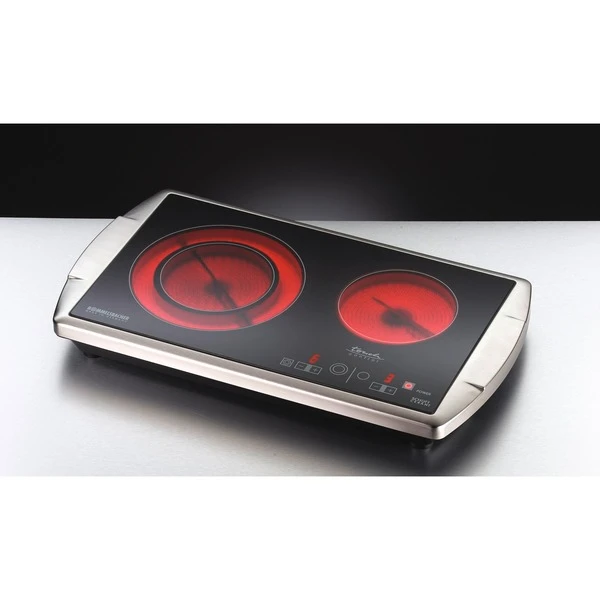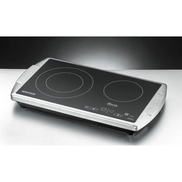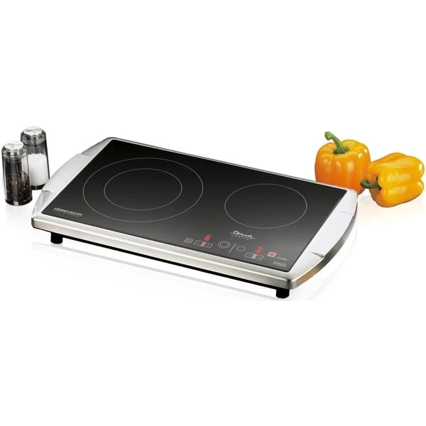 Die Zukunft hat begonnen: Nun gibt es von Rommelsbacher auch die Doppelkochplatte CT 3403/TC mit Glaskeramik Kochfeld in einem eleganten Edelstahl Gehäuse mit Softline Design. Die freistehende Kochplatte ist das Schmuckstück jeder Küche. Ideal als Zusatzgerät zum normalen Herd, perfekt für kleine Küchen, Büros und Appartements und äußerst beliebt im Catering Bereich für Buffets und Kochvorführungen. Die Ausstattung erfüllt alle Ansprüche: die HiLight® Heizzonen werden stromsparend über Touch Control in jeweils 9 Stufen geregelt. Die Zweikreis Lösung erlaubt die Zuschaltung einer extra großen Zone mit 210 mm Ø, perfekt für große Kochgefäße. Zwei Kontrolllampen und zwei Restwärmeanzeigen sind selbstverständlich. Überhitzungsschutz und Ankochautomatik sorgen für Sicherheit und besten Komfort.Art.-Nr.: 1518837