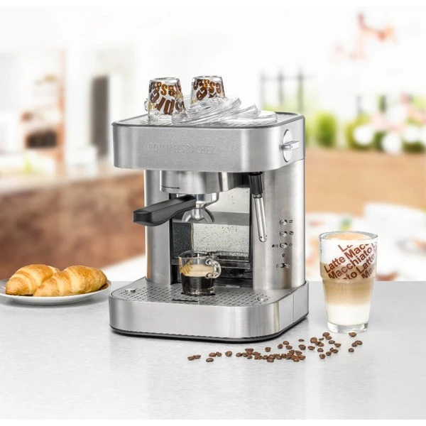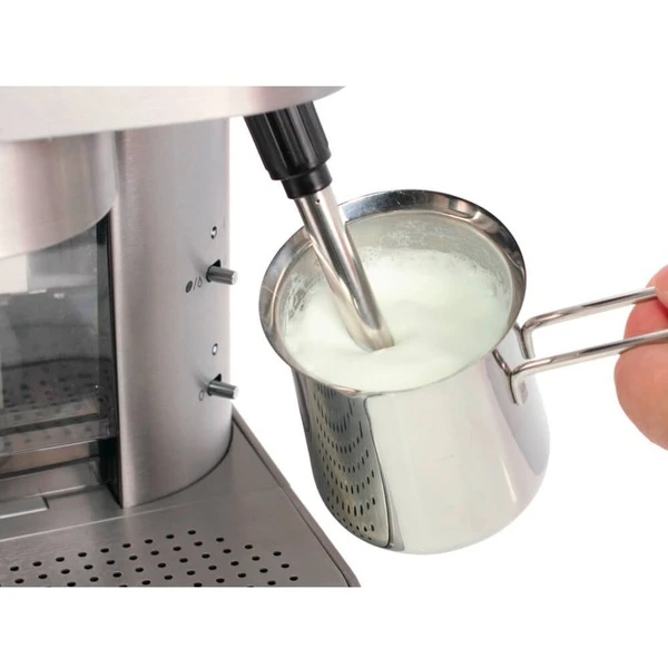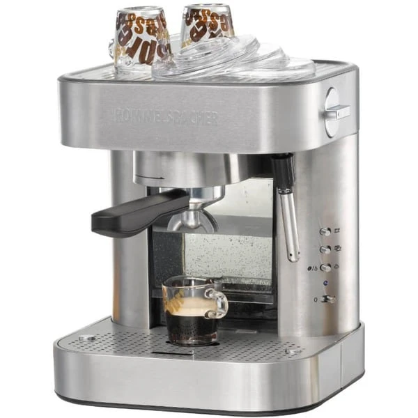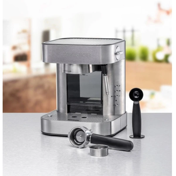 Die Rommelsbacher EKS 2010 Siebträger-Espressomaschine eignet sich optimal für die kleine Café-Bar zu Hause oder im Büro. Diese Espressomaschine mit hochwertiger Ausstattung brüht aromatischen Espresso mit einer feinen, dichten Crema. Dank einer leistungsstarken Qualitätspumpe und einem robusten Thermoblock aus Alu-Druckguss können frisch gemahlene Bohnen und auch Espresso/Kaffee Pads zu aromafrischen Kaffeespezialitäten verarbeitet werden. Über die abnehmbare Edelstahldüse lässt sich bequem leckerer, heißer Milchschaum zubereiten oder Heißwasser für Tee entnehmen. Ganz nach individuellem Geschmack kann die Tassenfüllmenge für 1 und 2 Tassen vorprogrammiert werden. Der massive 2-Loch-Siebträger liegt gut in der Hand, je nach Filtereinsatz lassen sich 1 oder 2 Tassen zubereiten. Der abnehmbare 1,5 Liter Wassertank mit elektronischer Wasserstandskontrolle ist mit einem Wasserfilter ausgestattet, der beste Wasserqualität ermöglicht. Für bequeme Handhabung sorgt die höhenverstellbare Tassenabstellfläche, die abnehmbare Abtropfschale mit Kontrollanzeige und die übersichtliche Bedienleiste mit LED-Kontrolllampe. Schick, hochwertig und vielseitig – perfekt für Liebhaber italienischer Kaffeespezialitäten.Art.-Nr.: 1518920