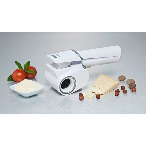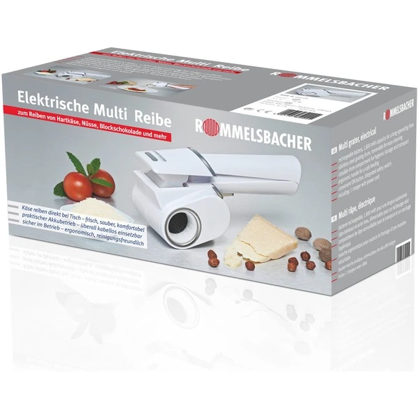 Mit der praktischen Multi-Reibe MR 6 von Rommelsbacher lassen sich feste Käsesorten wie Parmesan oder Grana Padano komfortabel und sicher reiben. Auch Blockschokolade und Nüsse lassen sich damit perfekt raspeln. Der praktische Akkubetrieb erleichtert die Arbeit, da die Reibe flexibel und unabhängig von der Steckdose zu benutzen ist. Zudem ist das Gerät so schick, dass man es gerne mit an den Tisch nimmt, um z. B. Hartkäse ganz frisch direkt auf den Pasta-Teller zu reiben. Damit nach dem Reiben keine Reste aus der Trommel fallen, kann diese mit einem Deckel hygienisch verschlossen werden. Die Bedienung selbst ist denkbar einfach. Mit nur einer Hand drückt man den Griff zusammen und presst dabei das Lebensmittel auf die Reibe. Zugleich aktiviert man auf der Unterseite die Einschalttaste; ein Sicherheitsschalter sorgt dabei für Sicherheit. Und am Ende lässt sich die Edelstahl Reibetrommel zur einfachen Reinigung entnehmen. Mit diesem Gerät wird Reiben zum Vergnügen und Kochen ein ganzes Stück komfortabler!Art.-Nr.: 1519874