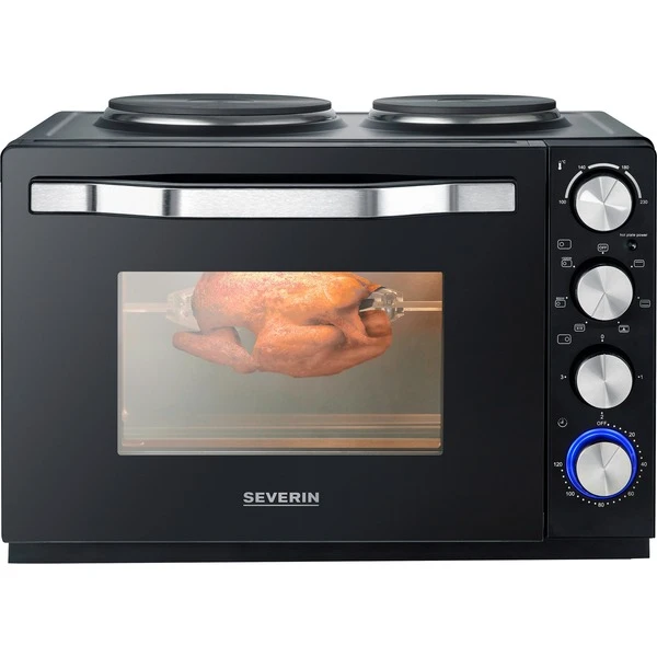 Der Severin Back- & Toastofen TO 2074 ist eine kompakte Kombination eines vollwertigen Backofens mit zwei Kochplatten zum Kochen, Grillen und Backen mit nur einem Gerät. Das Gerät ermöglicht die einfache Zubereitung von Grillhähnchen durch Grillfunktion mit enthaltenem Drehspieß und Drehspießantrieb. Außerdem bietet es vielfältige Zubereitungsmöglichkeiten von Pommes bis Kuchen dank Ober-/ Unterhitze, Umluftfunktion und mitgeliefertem Grillrost und Backblech. Zu den weiteren Zubereitungsmöglichkeiten gehören das Kochen mit Kochtopf oder Bratpfanne auf beiden Platten gleichzeitig, alternativ bei eingeschaltetem Backofen auf der kleinen Platte.Art.-Nr.: 1900489