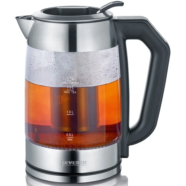 Der Digital Glas Tee- und Wasserkocher WK 3477 von Severin fasst bis zu 1,7 Liter Wasser und hat eine überzeugende Leistung von 2.200 Watt. Er bietet in 5°C-Schritten einstellbare Temperaturstufen von 40°C bis 100°C, und auf dem LCD-Display wird die Temperatur während des Kochens gradgenau angezeigt. Der feinfühlige integrierte Temperatursensor sorgt für höchste Temperaturgenauigkeit. Die „Quick-Boil Funktion“ ermöglicht die Auswahl von 100°C per einfachem Knopfdruck. Eine separate Warmhaltefunktion zur 30 minütigen Temperaturspeicherung hält den Tee schön warm, und der feinmaschige Teefilter aus Edelstahl lässt sich mit dem praktischen Griff sicher entnehmen. Dank dem 360º central-cordless-system ist der Wasserbehälter aus jeder Richtung auf den Gerätesockel aufsetzbar. Mit Dampfstopp-Automatik, Überhitzungsschutz und rutschfesten Gummifüßen ist der WK 3477 auch in Bezug auf Sicherheit eine gute Wahl. Der Wasserbehälter lässt sich dank verdeckter Heizschlange (Abdeckung aus Edelstahl) und abnehmbarem Deckel mit großer Öffnung leicht reinigen, und das Anti-Kalk-Sieb sorgt für sauberes Wasser beim Ausgießen.Art.-Nr.: 1340212