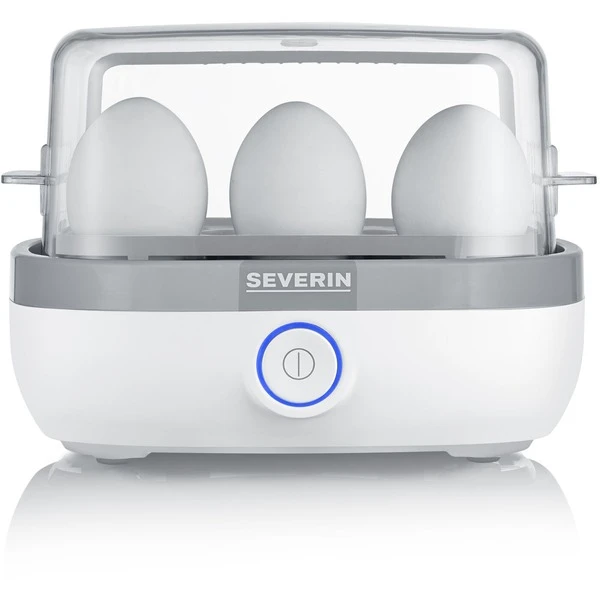 Der Severin Eierkocher EK 3164 bietet Platz für bis zu sechs Eier (S-XL). Mit einer Leistung von 420 Watt lassen sich Frühstückseier optimal kochen. Einfach mit dem beiliegenden Meßbecher kaltes Wasser abmessen, Eier in den Einsatz stellen und abdecken. Durch die klappbare und transparente Haube hat man den Kochvorgang immer im Blick. Die Bedienung erfolgt über einen Ein-/Ausschalter mit LED-Beleuchtung und nach beendeter Kochzeit ertönt ein Signalton. Durch das Perforieren der Eierschale mit dem integrierten Eierstecher an der Unterseite des Messbechers vermeidet man geplatzte Eier.Art.-Nr.: 1741042