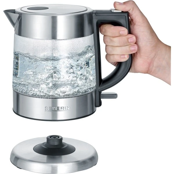 Der Wasserkocher WK 3468 von Severin ist ein kompakter, leistungsstarker Wasserkocher in hochwertiger Glas-Edelstahl-Kombination und 360° central-cordless system. Die 1-Hand-Bedienung ist praktisch und angenehm. Der integrierte Fingerschutz am Deckel, die Dampfstopp-Automatik und der Überhitzungsschutz sorgen für Sicherheit. Der Wasserbehälter lässt sich dank verdeckter Heizschlange (Abdeckung aus Edelstahl) und klappbarem Deckel mit großer Öffnung leicht reinigen und das Anti-Kalk-Sieb sorgt für sauberes Wasser beim Ausgießen.