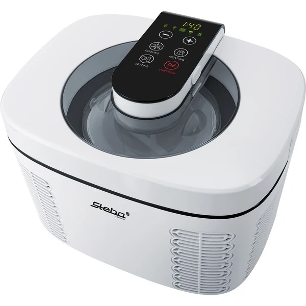 Mit der Eismaschine IC 110 von Steba lässt sich leckere Eiscreme individuell nach dem eigenen Geschmack herstellen. Vollautomatisch und selbstkühlend mit Peltier-Element für die perfekte Eiskonsistenz. So ist die IC 110 ohne Vorkühlen sofort einsatzbereit, doch sie eignet sich nicht nur für Eiscreme, durch die Wärmefunktion lässt sich auch Joghurt herstellen. Die Eismaschine verfügt über 5 Programme (Softeis / Eis / Sorbet / Joghurt / DIY). Das LCD-Display, ein 180 Min. Timer für Eis, ein 99 Std. Timer für Joghurt und das automatische Kühlhalten nach Ablauf der Zubereitungszeit sorgen für Komfort. Der Temperaturbereich liegt ca. zwischen -18°C bis +50°C. Neben dem Eisbehälter mit 1,2 Liter Volumen gibt es zusätzlich einen 1,1 Liter Joghurt-Behälter mit Deckel, beide sind, für eine leichte Reinigung, einfach entnehmbar.