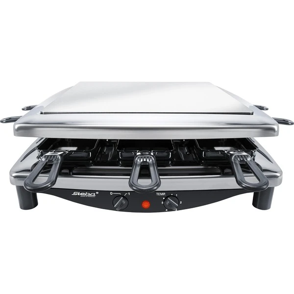 Das Premium Raclette Steel Deluxe RC 7 bietet Platz für acht Raclette-Pfännchen. Die Pfännchen sind schneid- und kratzfest und können in der Spülmaschine gereinigt werden. Die Grillfläche beträgt 26 cm x 26 cm und zum Zubereiten der verschiedensten Speisen ist das Raclette mit einer wendbaren Edelstahl-Grillplatte ausgestattet. An der Vorderseite des Steel Deluxe RC 7 befindet sich ein stufenloser Temperaturregler sowie ein Ein-/Ausschalter. Art.-Nr.: 1667433