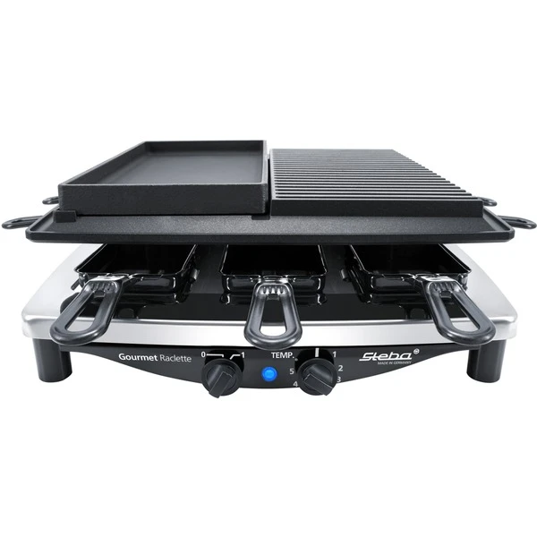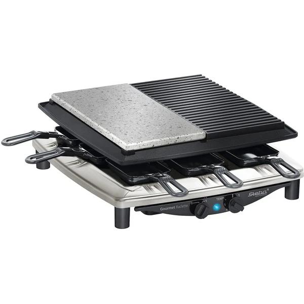 Das Raclette RC 4 Plus Deluxe hat ein Edelstahlgehäuse bietet Platz für acht Raclette-Pfännchen sowie zwei Grillplatten. Die Pfännchen sind emailliert, dadurch sind sie schneid- und kratzfest und können in der Spülmaschine gereinigt werden. Die Grillfläche beträgt insgesamt 29 cm x 29 cm und zum Zubereiten der verschiedensten Speisen stehen drei Grillplatten zur Auswahl, eine Antihaft-Druckguss-Grillplatte, eine Natursteingrillplatte und eine wendbare Gourmet-Guss-Pfanne mit glatter Fläche. An der Vorderseite des RC 4 Plus Deluxe befindet sich ein stufenloser Temperaturregler sowie ein Ein-/Ausschalter. Überschüssiges Fett und Bratenflüssigkeit läuft in eine dafür vorgesehene Auffangrille.Art.-Nr.: 1453981