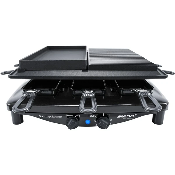 Das Raclette RC 4 Plus Deluxe hat ein Edelstahlgehäuse bietet Platz für acht Raclette-Pfännchen sowie zwei Grillplatten. Die Pfännchen sind emailliert, dadurch sind sie schneid- und kratzfest und können in der Spülmaschine gereinigt werden. Die Grillfläche beträgt insgesamt 29 cm x 29 cm und zum Zubereiten der verschiedensten Speisen stehen drei Grillplatten zur Auswahl, eine Antihaft-Druckguss-Grillplatte, eine Natursteingrillplatte und eine wendbare Gourmet-Guss-Pfanne mit glatter Fläche. An der Vorderseite des RC 4 Plus Deluxe befindet sich ein stufenloser Temperaturregler sowie ein Ein-/Ausschalter. Überschüssiges Fett und Bratenflüssigkeit läuft in eine dafür vorgesehene Auffangrille.Art.-Nr.: 1453982