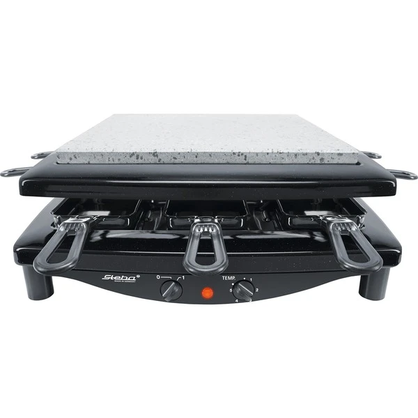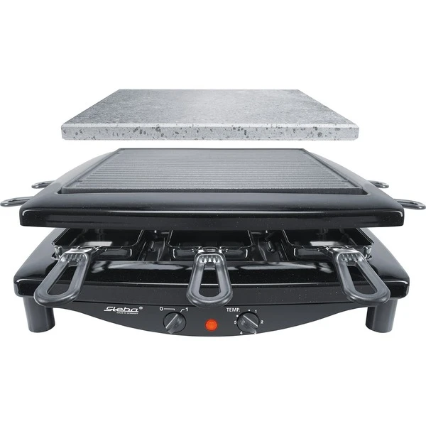 Der Steba RC 3 Plus Chrom Raclettegrill mit acht Pfännchen ist genau das Richtige für einen abend mit Freunden. Zum Zubereiten der verschiedensten Speisen stehen einem zwei Grillplatten zur Auswahl, eine wendbare, emaillierte Stahlguß-Grillplatte und eine kratzfeste Natursteingrillplatte. Die acht emaillierten Pfännchen sind schneid und kratzfest und dazu noch spülmaschinengeeignet. Die Grillfläche hat eine Länge von 26 cm und eine Breite von 26 cm. Auf der Vorderseite des RC 3 Plus Chrom befindet sich ein stufenloser Temperaturregler und ein Ein-/Ausschalter.Art.-Nr.: 934714