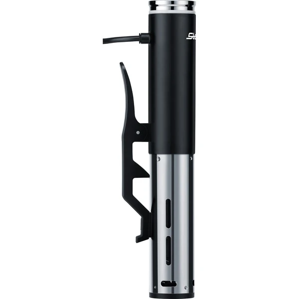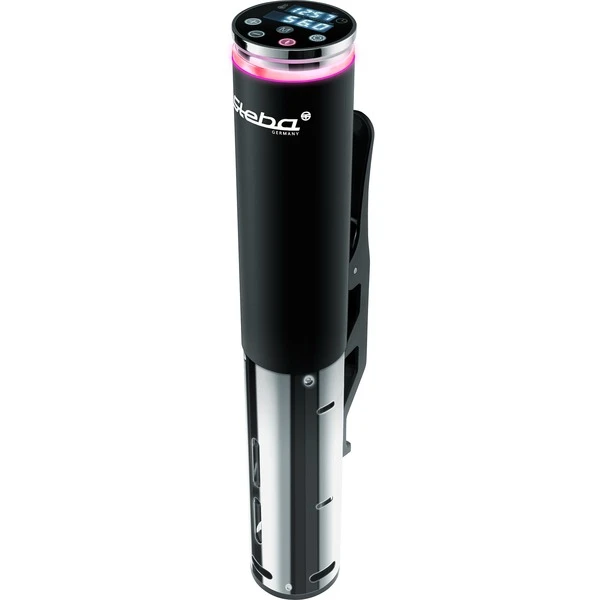 Mit dem Hochleistungs-Sous-Vide Garer SV 60 Professional von Steba gelingen die Gerichte im Handumdrehen. Er ist mobil einsetzbar, platzsparend & handlich. Der SV 60 wird in ein beliebiges Behältnis ab 15 cm Tiefe gehängt und erwärmt das darin enthaltene Wasser auf bis zu 95°C. SousVide ist eine Methode Lebensmittel in vakuumierten folienverschweißten Beuteln bei niedrigen Temperaturen über längere Zeit zu garen. Durch die Vakuumverpackung, die langsame Garung und die rundum Wärmeübertragung vom Wasser auf das Lebensmittel wird das Wachstum von Bakterien reduziert. Die Salze, der Eigengeschmack und die Saftigkeit bleiben erhalten! Der Sous-Vide Garer SV 60 erwärmt 20 Liter in ca. 45 Min auf 56°C mit einer max. Abweichung 0,1°C. Dazu ist der SV 60 mit 4 Automatikprogrammen ausgestattet. Das LC-Display gibt Auskunft über die eingestellte Zeit und die aktuelle Temperatur und es gibt 3 Farbanzeigen für Aufheizen, Garen und Garzeitende.