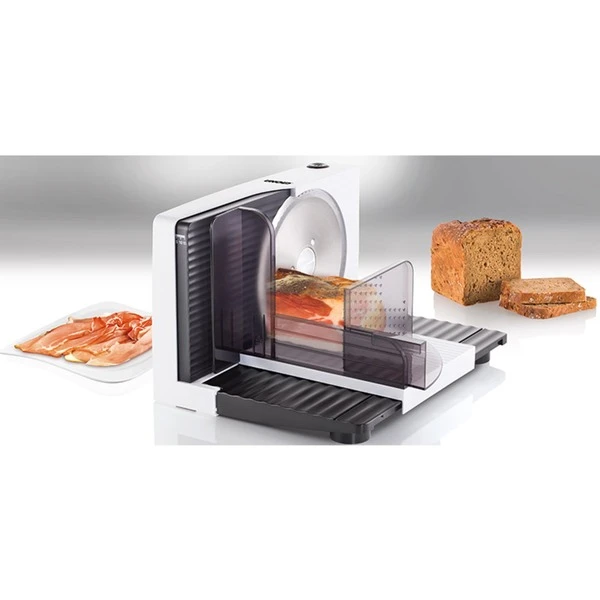 Von A wie Aufschnitt bis Z wie Zucchini: Wenn verschiedenste Lebensmittel in Scheiben geschnitten werden sollen, ist der Allesschneider Curve White unentbehrlich. Mit dem einfach entnehmbaren 17 cm Edelstahl-Wellenschliffmesser liefert der Allesschneider Curve White gleichmäßige Scheiben. Ob hauchfein bei Salami, Schinken und Co. oder dicker für knusperfrisches Brot oder köstlichen Braten, die Schnittbreite kann stufenlos von 0 bis 15 Millimeter eingestellt werden. In Sachen Sicherheit lässt der Allesschneider keine Wünsche offen. Für Sicherheit sorgen die Antirutschfüße sowie der Sicherheitsschalter mit Kindersicherung. Und der abnehmbare Restehalter mit Fingerschutz sorgt für das problemlose Schneiden ohne Reststücke – ohne Gefahr für die Fingerkuppen! Wird er gerade nicht benötigt, lässt er sich ganz einfach zusammenklappen und platzsparend im Küchenschrank unterbringen. Durch die integrierte Kabelaufbewahrung wird dafür das circa 135 Zentimeter lange Kabel perfekt verstaut.