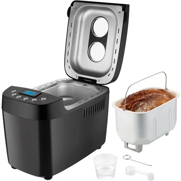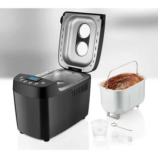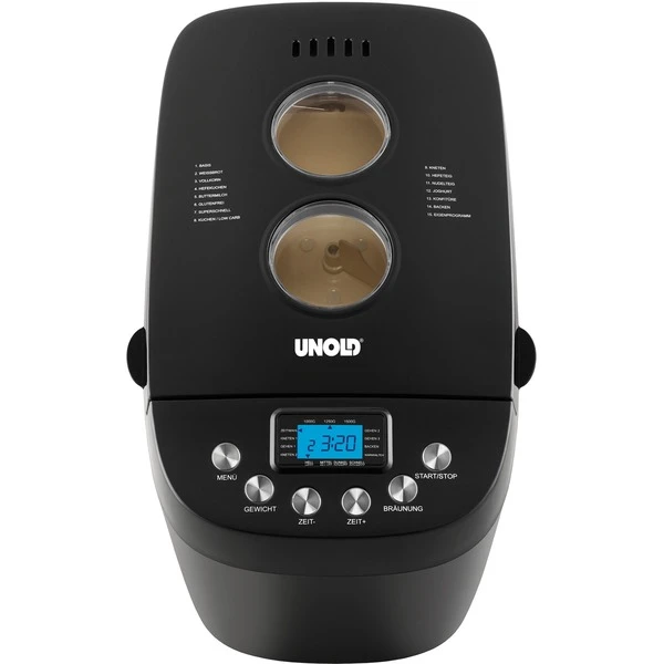 Hell, mittel oder dunkel – der BPA-freie Backmeister Big Black bietet den gewünschten Brot-Bräunungsgrad und die Größen: 1.000, 1.250, 1.500 g Brotgewicht. Nicht nur das! 15 gespeicherte Programme setzen auf hausgemachte Vielfalt u.a. für glutenfreies Brot, Marmelade/Konfitüre, Kuchen, Nudelteig oder Joghurt. Der leistungsstarke, robuste AC-Motor vermengt in der entnehmbaren Backform mit ihrem antihaftbeschichteten Doppelkneter alles gut. Durch zwei große Sichtfenster kann der Fortschritt immer beobachtet werden. Mit der Zeitwahltaste wird der Start bis zu 15 Stunden vorprogrammiert – und bei Stromausfall gibt es die Netzausfallsicherung für circa 15 Minuten, dann kann es mit dem gewählten Programm weitergehen. Auf dem benutzerfreundlichen, beleuchteten LCD-Display können Brotgröße und Bräunungsgrad festgelegt werden. Und selbst bei schwerem Brotteig sorgen die Antirutschfüße vom Backmeister Big Black für sicheren Stand. Zum Lieferumfang gehören Messbecher und -löffel, 2 Kneter, 1 Hakenspieß und eine Bedienungsanleitung mit vielerlei Rezepten.