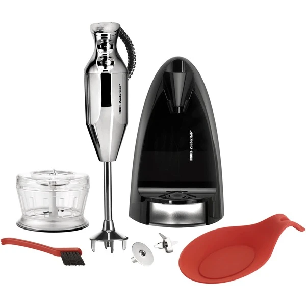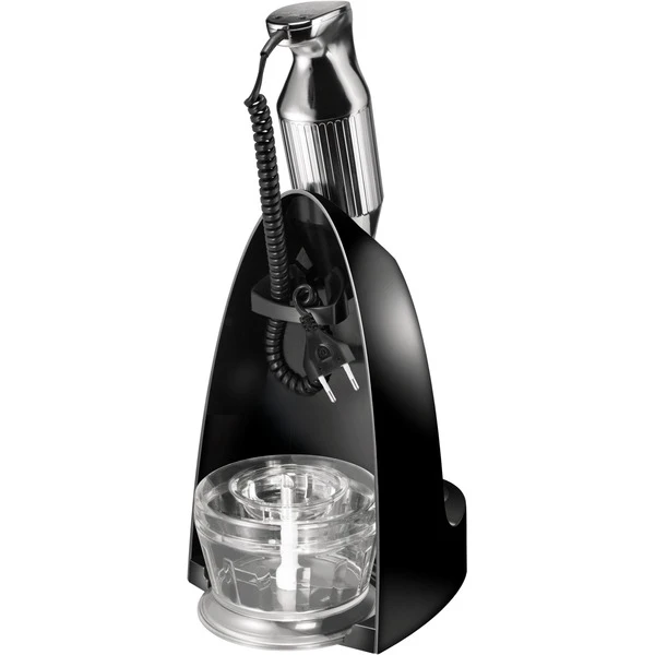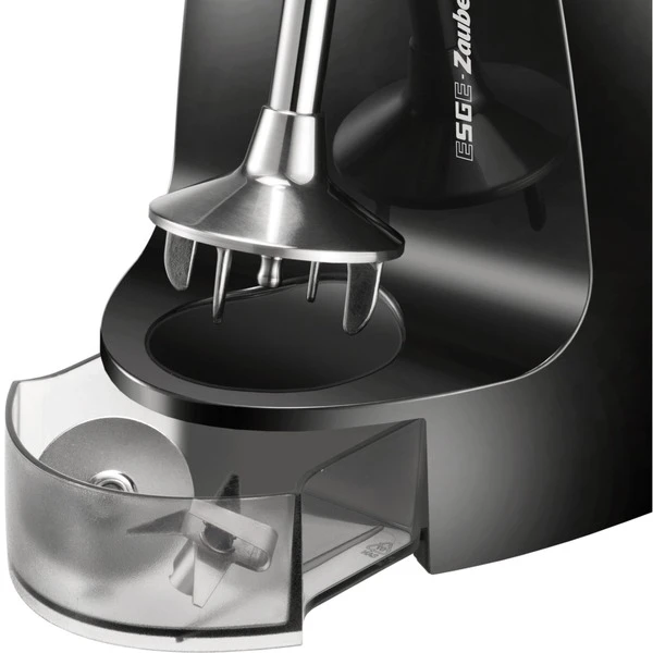 In Begleitung von reichlich Zubehör präsentiert sich der ESGE-Zauberstab M 200 Chrom in seinem stylishen Chrom-Outfit. Multimesser und Schlagscheibe können in der kompakten Zauberbasis aufbewahrt werden, in der der Zauberstab immer griffbereit ist. Paket umfasst auch den Zerkleinerer für Kräuter, Nüsse, Schokolade oder Parmesan. Serienmäßig gibt es außerdem eine Ablageschale aus Silikon für benutzte Kochutensilien dazu – und die praktische Reinigungsbürste, mit der die Aufsteckteile im Nu gesäubert werden können. Durch den Sicherheits-Twinschalter stehen wahlweise 12.000 oder 17.000 Umdrehungen pro Minute zur Verfügung – für den langlebigen, robusten AC-Motor „Made in Switzerland“ kein Problem. Mobil und bequem ist der ESGE Zauberstab durch das bis zu 150 Zentimetern ausziehbaren Spiralkabel und die Aufsteckzentrierung, die das Aufstecken der Zubehörteile ganz einfach macht.Art.-Nr.: 1670959