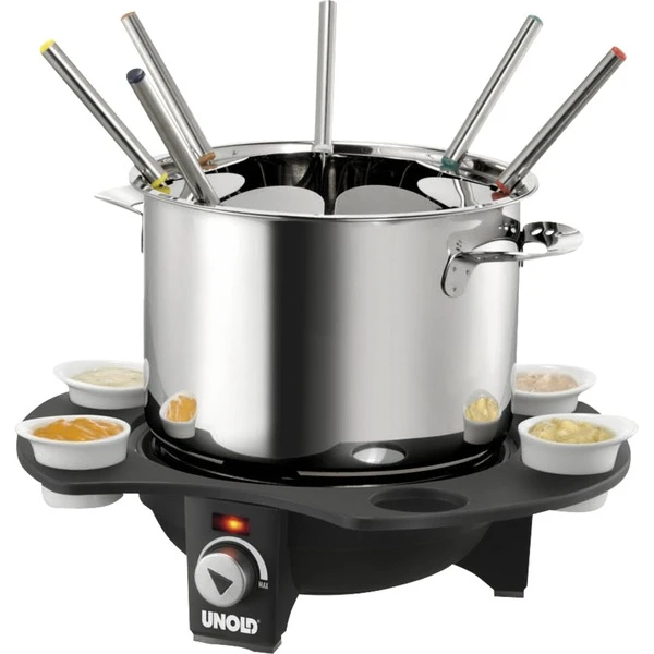 Das Unold Fondue 48645 Élégance ist ein sehr vielseitiges Fondueset für Menschen, die sich nicht bereits beim Kauf des Fondues für eine Fondueart entscheiden wollen. Das Fondue 48645 Élégance hat sowohl einen Edelstahl-Fonduetopf für Fleischfondue, als auch einen formschönen Keramiktopf für Käse- oder Schokofondue. Für die Fondue-Saucen ist das Set mit einem Kunststoffring und sechs Keramiktöpfchen ausgestattet. Bei dem Fondue 48645 Élégance sind alle nicht-elektrischen Teile spülmaschinengeeignet – und können dazu auch noch im Alltagshaushalt ihre Dienste tun. So eignet sich der Edelstahltopf für alle Herdarten außer Induktion. Und das Heizteil des Fondue 48645 Élégance ist auch als Kochplatte verwendbar.Art.-Nr.: 987476